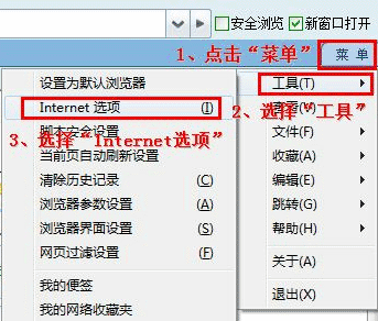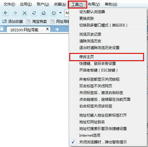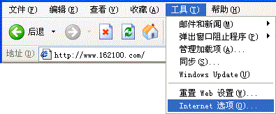 方法二:设置浏览器的“主页”选项 首先,打开浏览器上部菜单栏的“工具”栏,在下拉列表中选择“Internet 选项”,如下图所示: