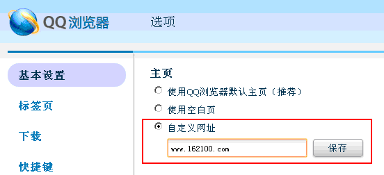 2)然后在打开的对话窗口中选择“自定义网址”并输入“http://wap.4385.cn/”,然后点击“保存”按扭即可,如图所示: