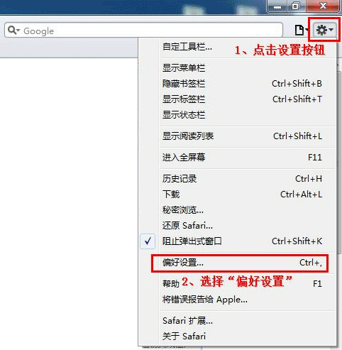 Safari浏览器设置主页的方法: 1)首先,点击“设置按钮”,在下拉列表中选择“偏好设置”,如下图所示: